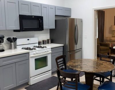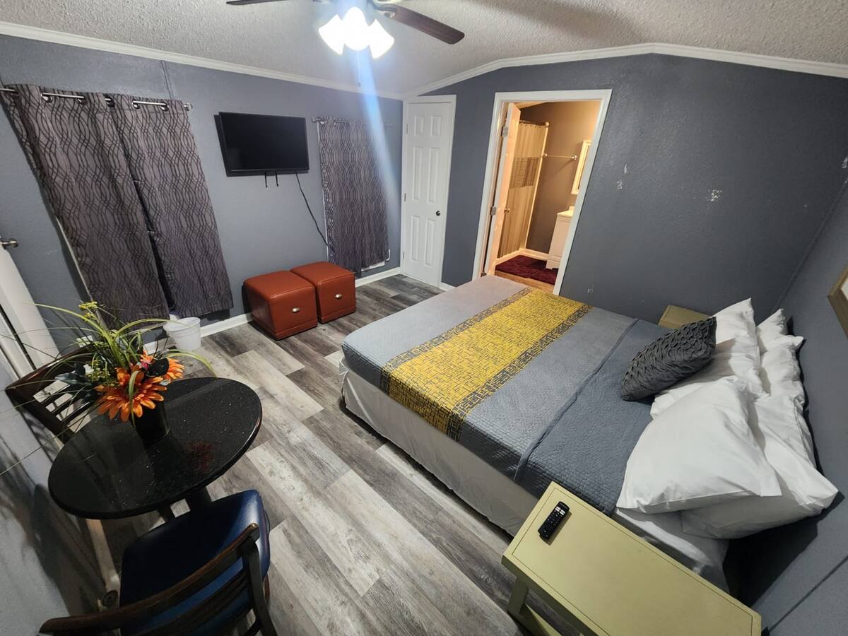 REAR GUESTHOUSE – Secluded Near Downtown. Guest house is 3BR 2BA contemporary decorated. Large beds used for all sleeping areas, and contains Large Yard with BBQ trailer and fire pit. Fully Fenced.