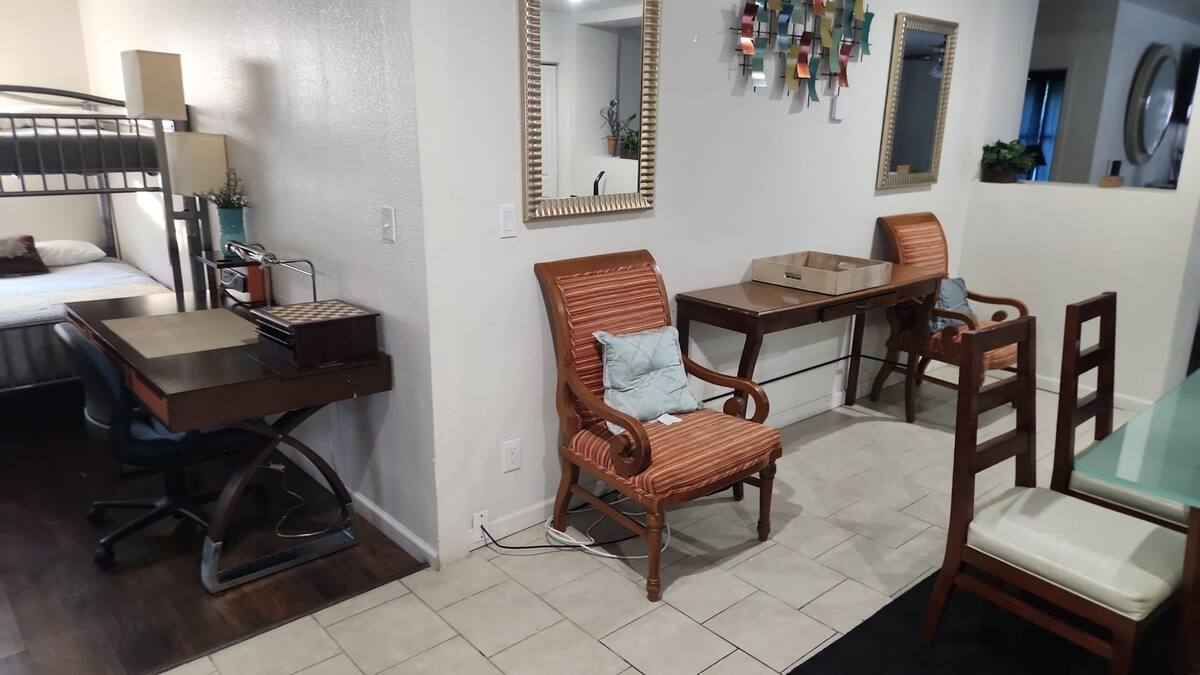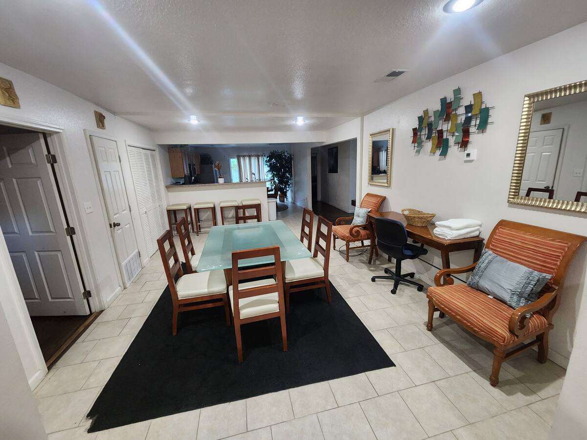 Huge single lever with in-law apartment and centrally located . There are 3 king beds, 2 queens, 4 full, all distributed in 6 sleeping areas, all smart television in all 4 bedrooms. has a total of 3 full bath, multiple dining areas. abundant parking and 2 central air and heating. Strong Wi-Fi and multiple exterior security cameras.